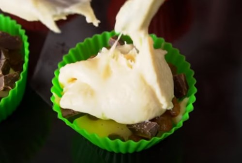 - Розтопіть другу шоколадку, полийте готові маффіни зверху. Якщо залишилося ще трохи, натріть його в крихту і посипте кекси зверху.