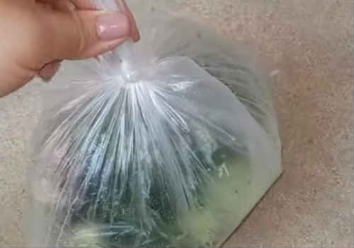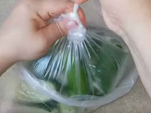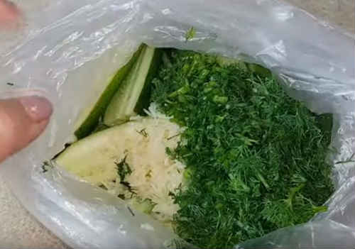 Беріть 2 тонких пакета, щоб вони не порвалися з час маніпуляцій, вкладіть один в інший, так буде надійніше. Закиньте заготівлі огірків.