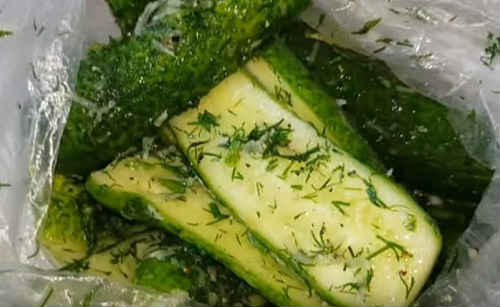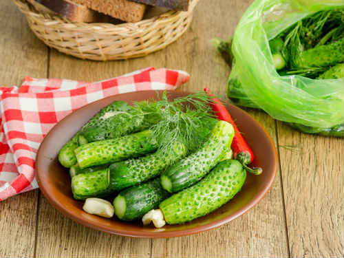 Огірки, швидко мариновані в пакеті з кропом