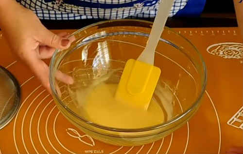 Будь-яким способом розтопіть масло, додайте в суміш. Витримайте традиційні 5 хвилин.