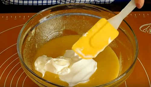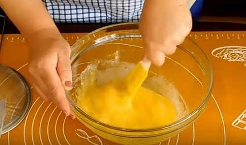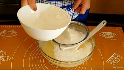 - Через наступні 5 хвилин засипте борошняний продукт. Обов’язково просіяти борошно, збагативши киснем. Розбийте грудочки, отримавши в результаті досить рідке тісто, що нагадує сметану.