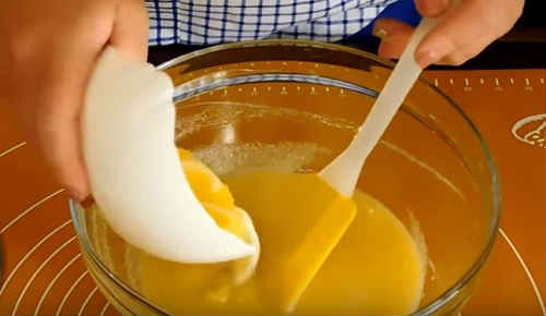 - Розтопіть масло, мед. Змішайте спочатку вершкове масло з теплим молоком, яйцями, медом. Додайте погашену оцтом соду.