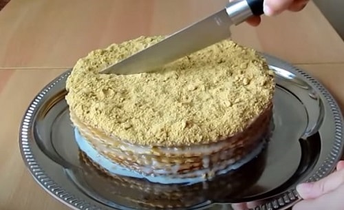 Пам’ятайте, ми запікали разом з коржами обрізки тіста? Будь-яким способом роздрібніть їх, щедро посипте верх медівника, при бажанні прикрасити боки торта.