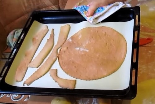 Постеліть на деко пекарську папір, викладіть корж, поруч розкладіть обрізки тіста – вони нам знадобляться для крихти. Спечіть в духовці, прогрітій до 200 про С. Час випікання коржів – 5-7 хвилин.