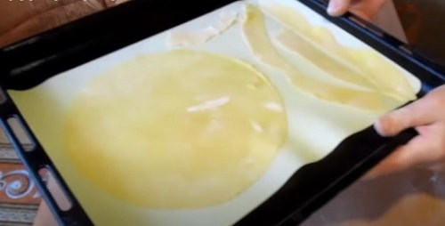 Перед вами готовий корж. Спочатку він буде м’яким, потім поступово затвердіє. Подібним чином заготовте всі коржики – основи для торта.