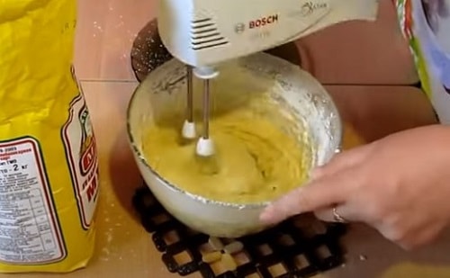 Коли зникнуть грудочки, підсипте наступну порцію борошна, і так, поки продукт не закінчиться. Спочатку вимішуйте міксером.