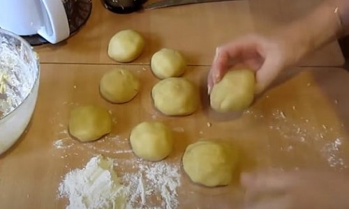 Потім, коли тісто стане більш крутим, перейдіть на стіл, припудривши його борошном. Зберіть масу в ком, гарненько вимісіть його руками. Скачайте в довгу ковбасу, як на фото. Наріжте тісто на шматочки однакового розміру, поділивши за кількістю коржів. Загалом має вийти 10-12 кульок.