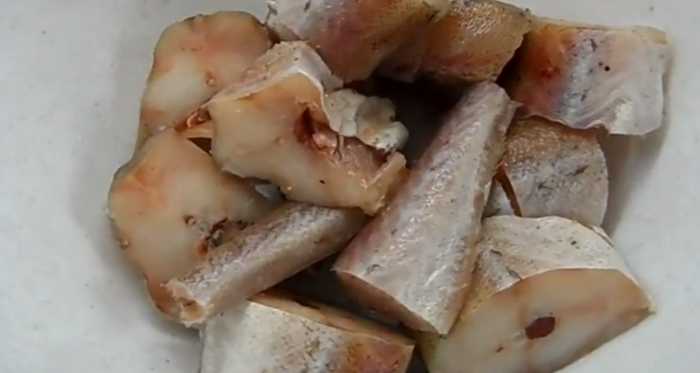 1. Очищену і митий рибу складаємо в глибоку термостійку посудину, зверху кидаємо сіль (приблизно половину чайної ложки), перець і лаврушку. Все заливаємо водою і ставимо на варильну поверхню. Після того як рідина закипить, з його поверхні знімаємо пінку, закриваємо і відварюємо рибу протягом чверті години.
