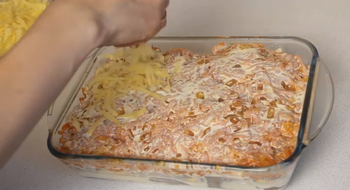 5. На рибу рівномірним шаром викладаємо пасеровку, яку поливаємо вершково-майонезній сумішшю і посипаємо тертим сиром.