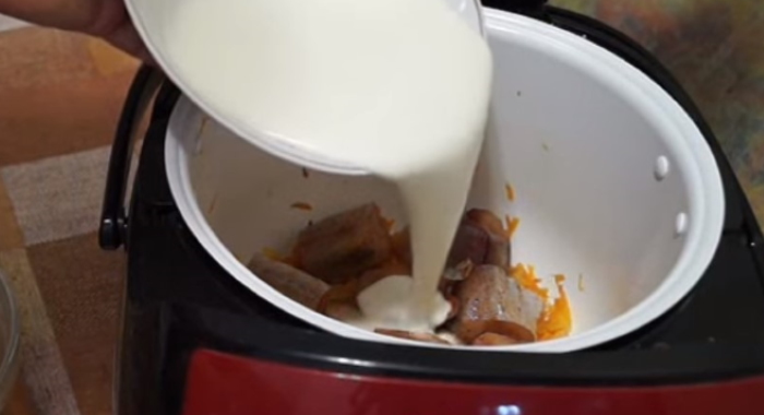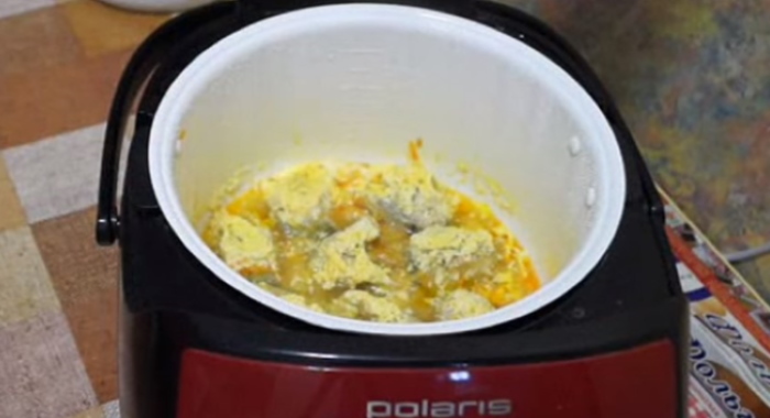 4. Через 20 хвилин від початку роботи мультиварки, на овочеву подушку розкладаємо шматочки минтая, які заллємо сметано-вершковою сумішшю. Прилад закриваємо і чекаємо звукового сигналу, який сповіщає про закінчення готування.