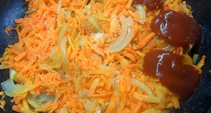 3. В пасеровку додаємо кетчуп, трохи підсолюємо овочі, перемішуємо, закриваємо і продовжуємо тушкувати ще 3 хвилини.