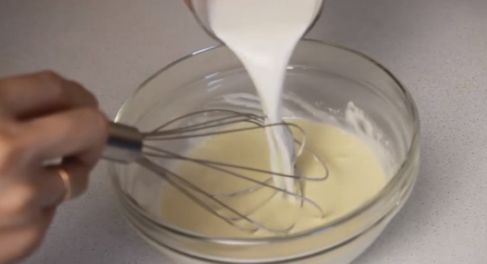 3. Для заливки змішуємо вершки з майонезом і ретельно розмішуємо суміш до однорідності.