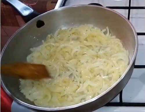Наріжте цибулю півкільцями, відправте на сковорідку у добре розігріте масло. Обсмажте до прозорості.