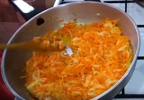 Натріть моркву великої стружкою, додайте цибулю. Обсмажуйте овочі разом до приємно золотавості.