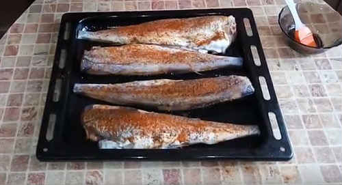 - Обробіть минтай, наріжте стейками або філе. Складіть в миску, натріть приправами для риби, змішаними з сіллю і перчиком. Потримайте хвилин 20, щоб риба встигла замаринуватися.