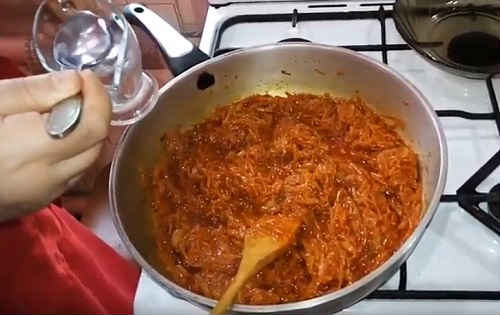 - Наріжте кубиками цибулю, обсмажте 2-4 хвилинки. Потім додати потерту крупно моркву. Через 3-5 хвилин обсмажування, додайте сіль з цукром. Влийте майонез, сметану, есенцію.
