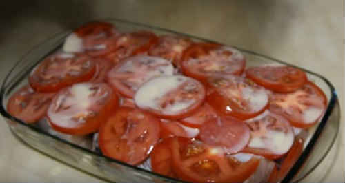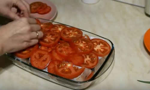 Накрийте шаром помідорів. Кладіть щедро, вони осядуть під час приготування, а сік їх вбере рибка.