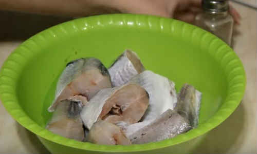 Наріжте шматочками, стейками, не прибираючи хребет. Посоліть, посипте перцем, добре перемішайте руками. Дайте трохи постояти.
