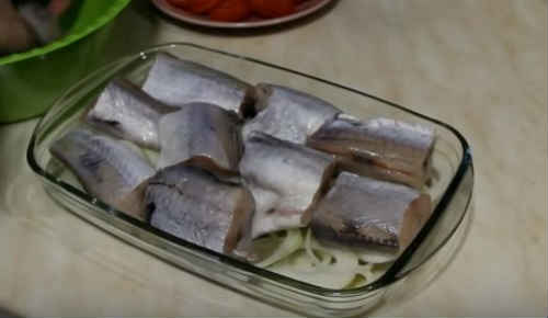 - Викладіть половину овочів на дно жароміцної форми, зверху розкладіть шматочки минтая.