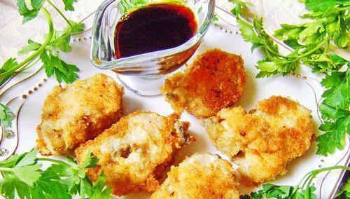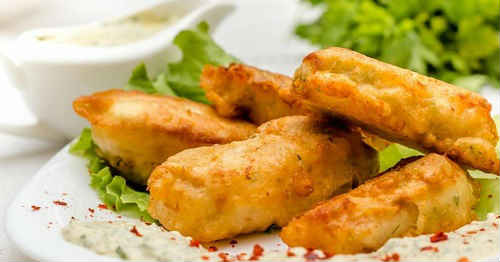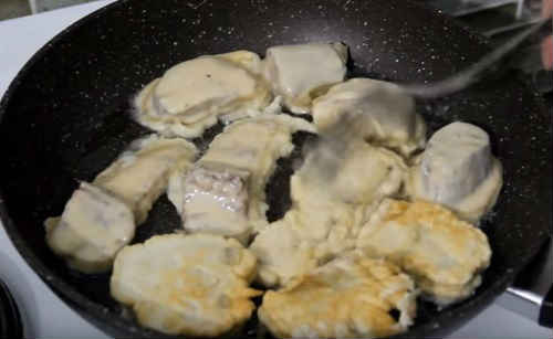 - Умочіть заготовки у густе тісто, викладіть на сковороду. Посмажте до хрусткої скоринки.