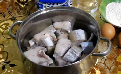 - Обробити тушку на філе минтая, поділіть невеликими шматочками.