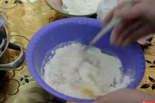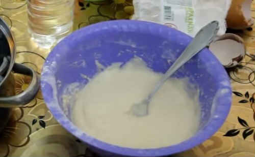 - У кілька прийомів підсипте борошно. Розбийте грудочки, у вас повинно вийти тісто, по консистенції нагадує густу сметану.