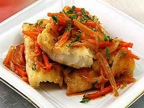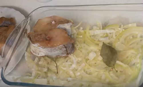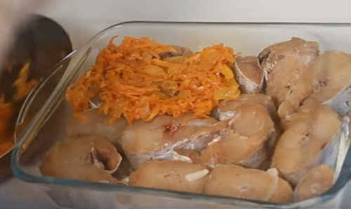 - Перекладіть у форму. У тому ж маслі посмажте мариновані овочі. Додайте їх до риби, вилийте залишився маринад.