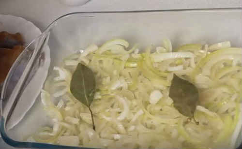 Змастіть жаростійку форму маслом. На дні форми зробіть подушку з цибулевих кілець. Любите аромат лаврового листочка – покладіть парочку.