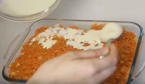 Накрийте рибу обсмаженими овочами, розрівняйте шар.