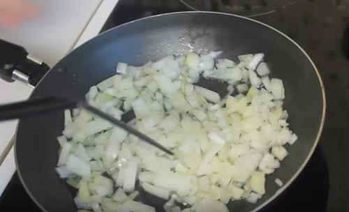 Дрібну цибульну нарізку надішліть на сковорідку з розігрітою олією. Пасеруйте до прозорого стану буквально пару хвилин.