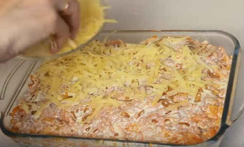 - Посипте сиром, поставте в духовку. Час приготування 25 хвилин при 180 про С. Побачите рум’яну скоринку – пора діставати і отримувати задоволення.
