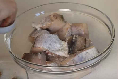 Наріжте розморожені тушки риби порційними шматочками. Складіть в миску, посипте все, перераховані в рецепті, приправи, додайте цукор. Перемішайте руками, відставте в сторону маринуватися.