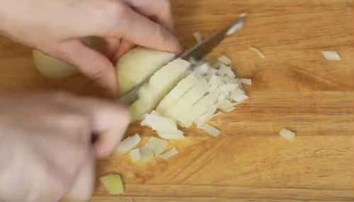 Одну з цибулин наріжте дрібним кубиком, другу наріжте півкільцями. Півкільця складіть окремо, присоліть, поперчіть, залиште маринуватися.