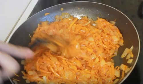 - Обсмажте моркву з цибулею на сковороді до м’якості. Не забудьте трохи підсолити і поперчити.