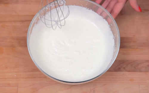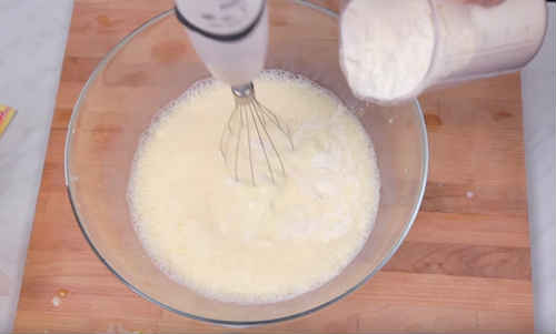 Не гаючи часу збийте крем. Для цього викладіть в миску сметану, додайте пудру і збийте. Беріть сметану великий жирності, вона краще зіб’ється, консистенція буде густіше.1