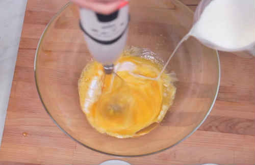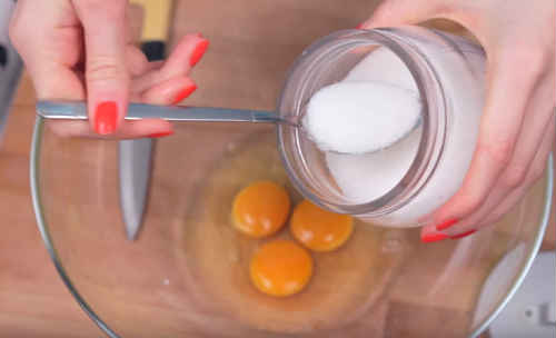 Розбийте в миску яйця, підсипте цукор. Збийте міксером або віночком. Якщо не любите надто солодкі десерти, зменшіть кількість цукру, оскільки крем також буде солодким.