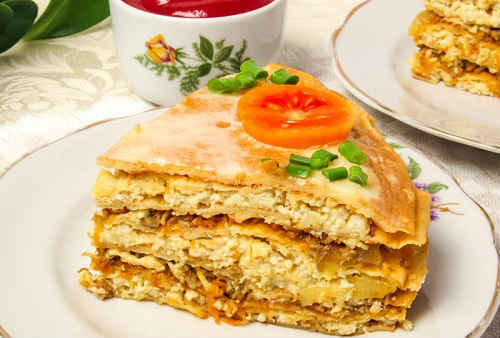 Існує ряд несолодких закусочних тортів. Серед них особливою популярністю користується начинка з куркою, грибами, оселедцем, шинкою. Закуску оцінять домашні, порадіють гості, і ви уславитеся знатної господинею.