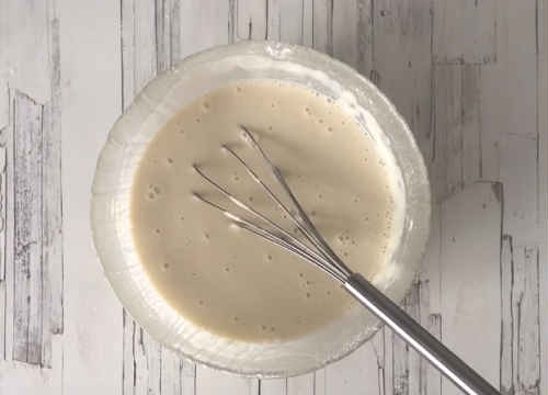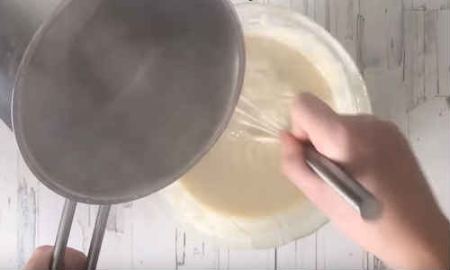 Закип’ятіть воду, цівкою влийте в миску, не перестаючи активно пробивати вміст.