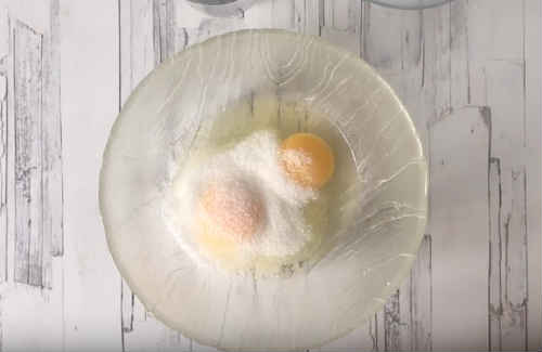 Розбийте в миску яйця, закиньте білий і ванільний цукор. Розтирайте, поки суміш не почне пузиритися, до легкої білизни. Цукор повинен повністю розчинитися. Можна діяти по-старому, віночком, але швидше й зручніше працювати міксером.