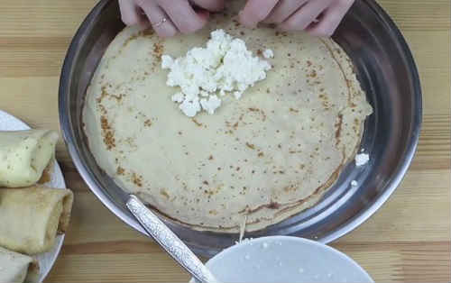 Багато господині, в тому числі і я, пропускають обсмажування другої сторони, оскільки млинці з сиром до подачі на стіл зазвичай обсмажуються. Але тоді начинку викладайте на вже смажену бік.