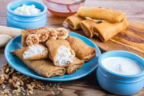 - Фаршируйте коржі сирною начинкою, звертаючи трубочкою або трикутником. Потім швидко обсмажте, присипте цукровою пудрою і подавайте.