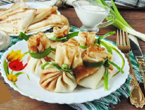 - Викладіть на край млинчика велику ложку начинки, загорніть будь-яким способом.