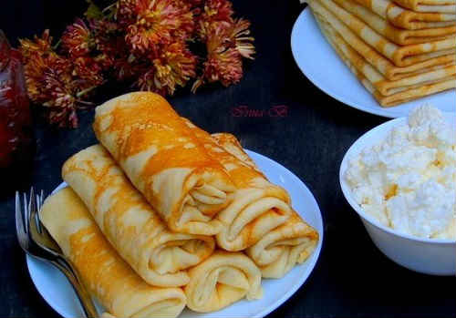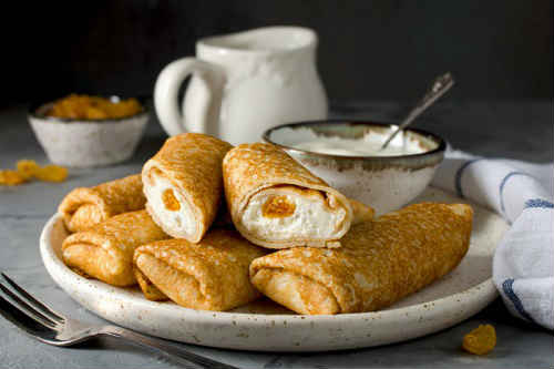 Друзі, діставайте сковорідки – на дворі Масляна! А якщо вам вже набридли прості млинці на молоці або кефірі, нафаршируйте їх солодкої сирною начинкою і влаштуйте собі свято живота. Навіть зазвичай обсмажені на сковороді, такі млинці — не страва, а пісня, особливо, коли зробиш начинку з родзинкою або згущеним молоком. Ну а якщо запекти їх в духовці зі сметаною, то вийде справжній шедевр.