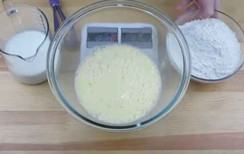 - Введіть сіль, цукор, частину молока, гарненько розмішайте. Слідом додайте залишки молока, просіяне борошно. Збивайте віночком або міксером до однорідності.