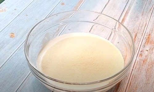 Поки манник випікається, закип’ятіть молочний продукт, остудіть його трохи. Напій повинен бути гарячим, не теплим. Залийте пиріг, повністю покривши його. Враховуйте, що манник заливається відразу після приготування, ще гарячим. Якщо любите солодку випічку, додайте в молочну просочення трохи цукру.