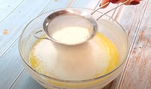 Змішайте борошно з пекарським порошком. Просеивайте прямо в посудину з кефірної масою. Зробіть заміс.