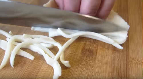 Охолодіть, поділіть кальмари соломкою.