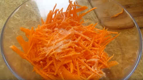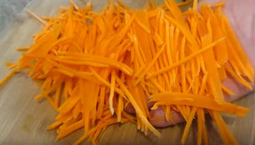 Приготування починайте з морквини. Задійте корейську тертку, щоб нарізка була характерною для корейської кухні соломкою.