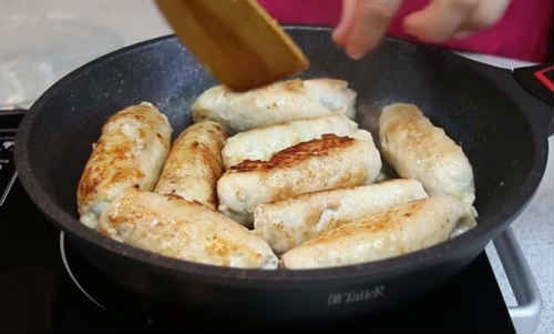 - Скрутіть конструкцію в рулет, посмажте на маслі по 3 хвилини з кожного боку.