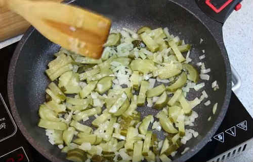 Закладіть огірки, продовжуйте смажити ще пару хвилин. Викладіть в миску, остудіть.